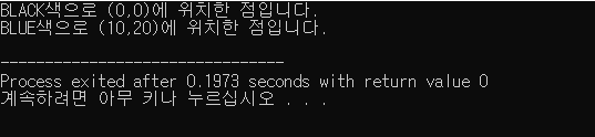 cout << color << "색으로 (" << getX() << "," << getY() << ")에 위치한 점입니다.\n";